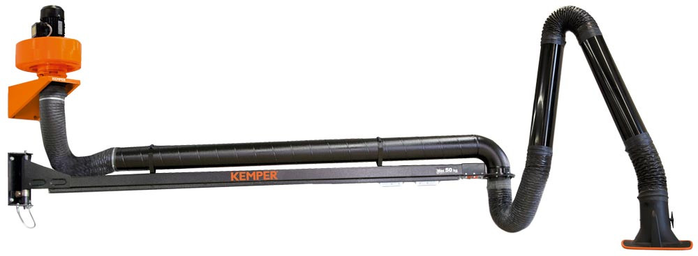Ausführung: Abluftset bestehend aus Ausleger, Absaugarm und Ventilator ∙ 360° drehbare Absaughaube mit Drosselklappe ∙ Innenliegendes Parallelogramm-Trägergestänge mit Federunterstützung ∙ Ventilator aus funkensicherem Siluminguss, besonders geräuscharm ∙ Ausleger mit integrierter C-Schiene mit Laufwagen ∙ Schlaucharm: Polyestergewebeschlauch, PVC beschichtet und mit eingeschweißter Stahldrahtspirale ∙ Rohrarm: Pulverbeschichtetes Aluminiumrohr, drei flexible Schlauchstücke