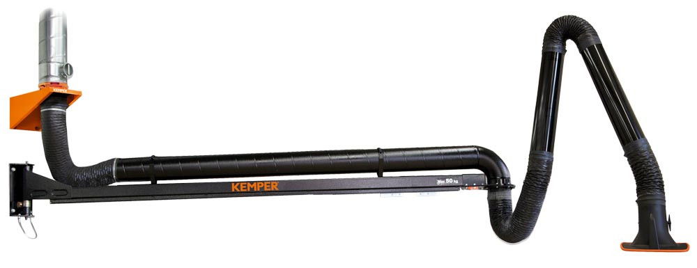 Ausführung: Bestehend aus einem innenliegenden Parallelogramm-Trägergestänge mit Federunterstützung ∙ Schlaucharm aus Polyestergewebe, PVC beschichtet und mit eingeschweißter Stahldrahtspirale ∙ Rohrarm aus pulverbeschichtetem Aluminiumrohr Ø 150 mm und drei flexiblen Schlauchstücken sowie der Absaughaube mit Drosselklappe ∙ Absaugarme halten jede gewünschte Position freitragend bei ∙ Um 360° drehbare Absaughaube in jede Richtung schwenkbar ∙ Ausleger mit 50 kg Tragkraft und mit integrierter C-Schiene mit Laufwagen