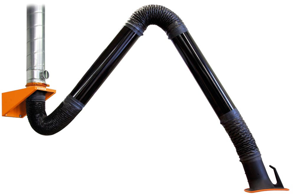 Ausführung: Bestehend aus einem innenliegenden Parallelogramm-Trägergestänge mit Federunterstützung ∙ Schlaucharm aus Polyestergewebe, PVC beschichtet und mit eingeschweißter Stahldrahtspirale ∙ Rohrarm aus pulverbeschichtetem Aluminiumrohr Ø 150 mm und drei flexiblen Schlauchstücken sowie der Absaughaube mit Drosselklappe ∙ Absaugarme halten jede gewünschte Position freitragend bei ∙ Um 360° drehbare Absaughaube in jede Richtung schwenkbar