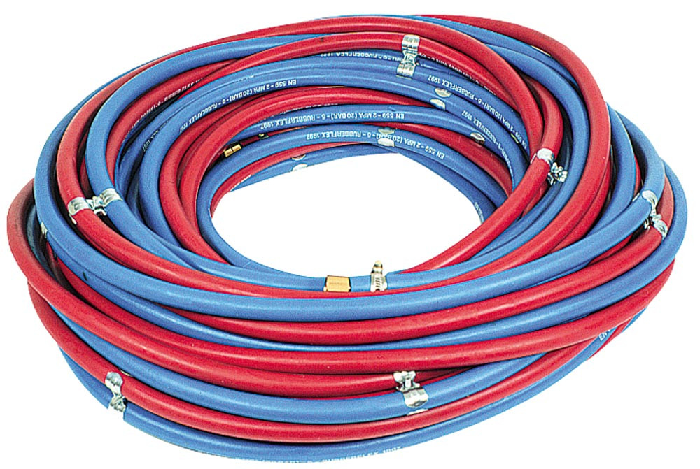 Ausführung: Für Sauerstoff (blau) und Acetylen (rot) ∙ Konfektioniert: Überwurfmutter und Schlauchtülle aus Messing EN 560, Schlauchhülse und Doppelschlauchklemme aus Stahl, verwendete Schläuche entsprechend ISO3821, bzw. DIN 4815 (Propan)