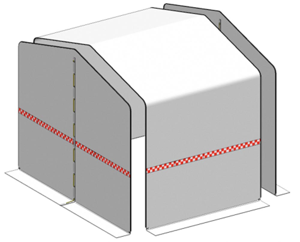 Ausführung: Arbeitszelt aus schwer entflammbarem, mit PVC beschichtetem Polyester-Gewebe (M2 nach NF-P 92-503) ∙ Sämtliche Teile mit wasserabweisenden Reißverschlüssen verbunden ∙ Hervorragende Wasserabführung durch 15° Dachneigung ∙ Keine Bildung von Wassersäcken ∙ UV-stabil ∙ Witterungsbeständig ∙ Temperaturbeständig - 30 °C bis + 70 °C ∙ Verrottungsfest ∙ Abwaschbar ∙ Schwer entflammbar für Schweiß- und Flexarbeiten geeignet ∙ Das HD Zelt besteht aus mindestens 1 Dachplane und 2 Gabelplanen ∙ Gummiband mit Kugel um jeden Fuß ∙ Ständer mit Grundstift zur Verankerung
