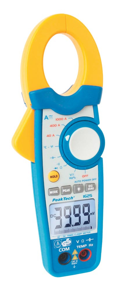 Ausführung: Mit True RMS und 3 ¾-stelliger LCD-Anzeige ∙ Balkengrafik-Anzeige mit 42 Segmenten ∙ Robustes, bruch- und feuerfestes Gehäuse mit Gummischutz ∙ Tropfenförmige Klemmbacken für den Einsatz in schwer zugänglichen Bereichen ∙ Automatische Bereichswahl ∙ Effektivwert-Messung ∙ Min-/Max- und Messwerthaltefunktion ∙ Hintergrundbeleuchtung ∙ Spannungsmessung bis 600 V AC/DC ∙ Strommessung AC/DC bis 1000 A ∙ Widerstands-, Frequenz-, Kapazitäts- und Temperaturmessfunktion ∙ Diodentest und akustische Durchgangsprüfung ∙ Abschaltautomatik ∙ Geeignet für Leiterdurchmesser bis 35 mm ∙ Sicherheit: TÜV/GS, EN 61010-1, CAT III 600 V ∙ Zubehör: Typ-K-Temperaturfühler, Tasche, Prüfleitungen, 9V-Batterie und Bedienungsanleitung ∙ Abmessungen (BxHxT) 80 x 230 x 50 mm ∙ Gewicht 300 g