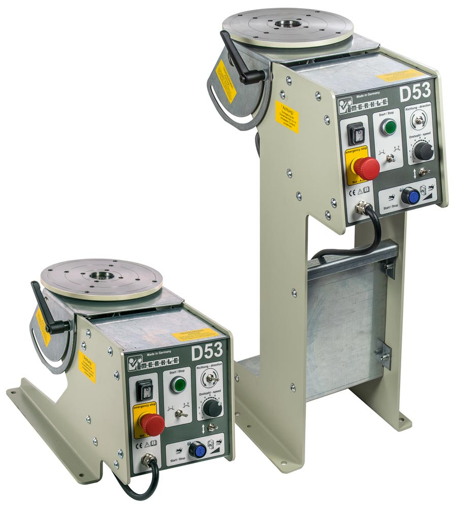 Ausführung: Drehtische mit schwenkbarer Planscheibe im Schwenkbereich von 135° in jeder Position feststellbar ∙ Universelle Anordnung von Gewindebohrungen zur Aufnahme von unterschiedlichen Spannwerkzeugen ∙ Zentrierbohrung in der Planscheibe ∙ Zentrale Durchgangsbohrung für Kühlwasser, Druckluft oder Formiergas ∙ Rechts-/Linkslauf und stufenlose Drehzahlregulierung ∙ Elektronik in geschlossenem Gehäuse ∙ Bedienungselemente übersichtlich auf der Frontplatte angeordnet ∙ Stromabnehmer für Schweißstromübertragung mit hoher Belastbarkeit und Einschaltdauer