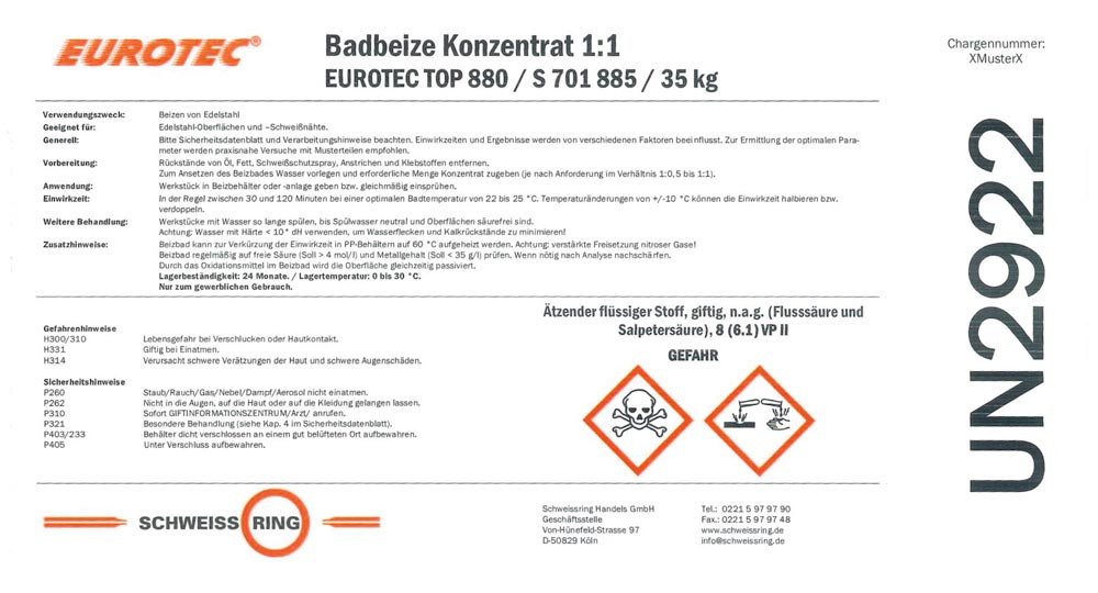 Ausführung: Flüssiges Beizbadkonzentrat enthält Flusssäure und Salpetersäure ∙ Entfernt Anlauffarben, Oxidschichten und Fremdrost von Edelstahloberflächen und Schweißnähten ∙ Ergebnis der Behandlung ist eine helle, metallisch reine Oberfläche ∙ Passivierung erfolgt während des Beizens
