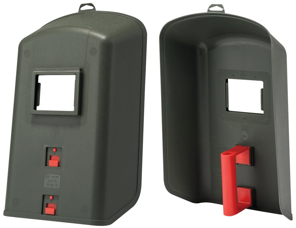 Ausführung: Nach EN 175 und PSA-Verordnung 2016/425 ∙ DIN- und CE-geprüft ∙ Aus grauem Kunststoff ∙ Gerade Ausführung mit innenliegendem Handgriff ∙ Schwer entflammbar ∙ UV-beständig ∙ Keine Feuchtigkeitsaufnahme ∙ Kälte- und hitzebeständig von -20 °C bis 200 °C ∙ Lieferung ohne Gläser