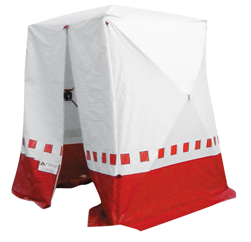 Ausführung: Arbeitszelt aus PVC-beschichtetem Gewebe ∙ Schwer entflammbar ∙ Farbe weiß mit roter Spritzschutz-Schürze ∙ Von einer einzelnen Person innerhalb von wenigen Sekunden aufbaubar