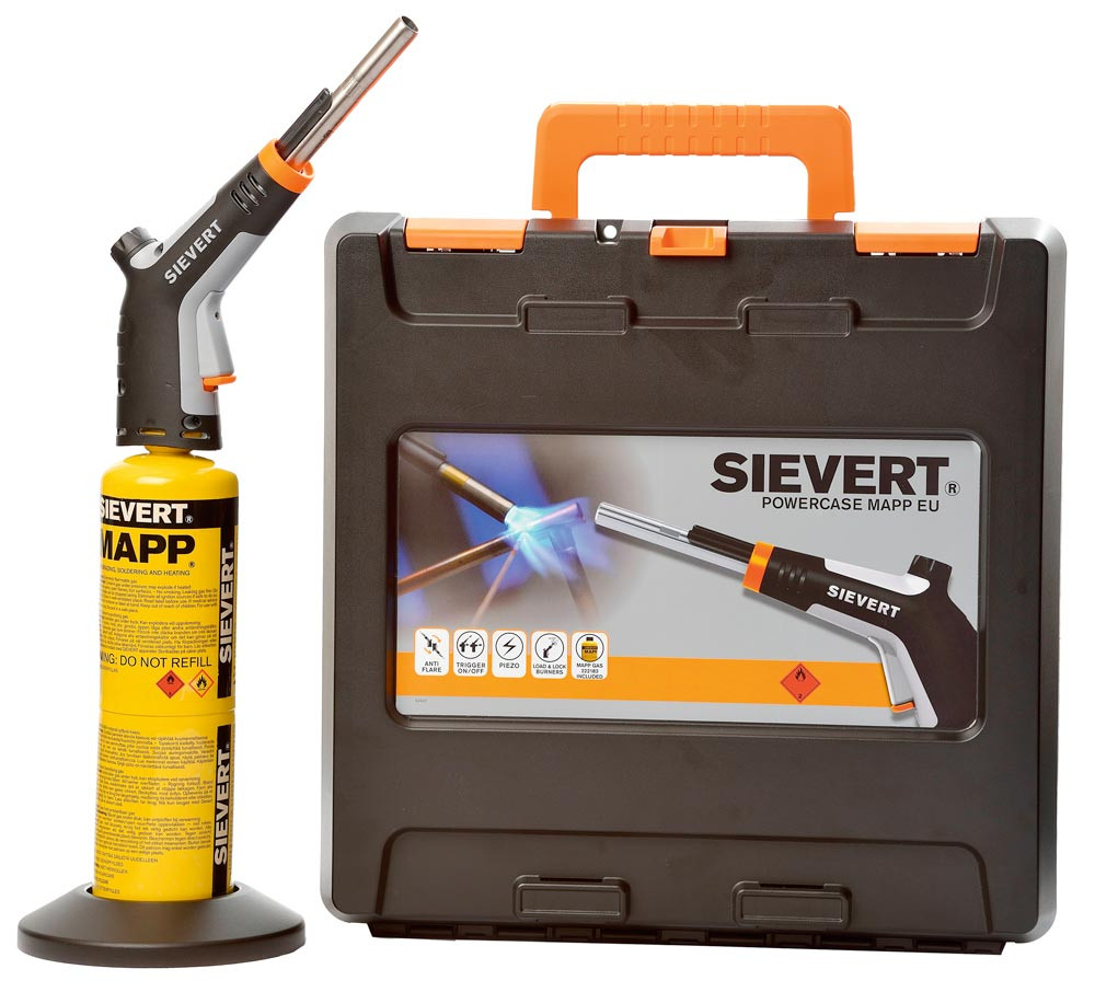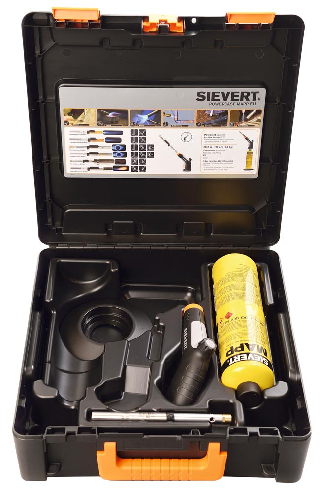 Inhalt: 1 PowerJet Lötlampe (EU Anschluss) ∙ 1 Zykonbrenner 8706, 14 mm ∙ 1 Stützfuss für Gaskartusche ∙ 1 Powercase Transportkoffer ∙ 1 MAPP® Gas 2221 Kartusche (EU Kartusche) ∙ Platz für eine zusätzliche Gaskartusche ist vorhanden