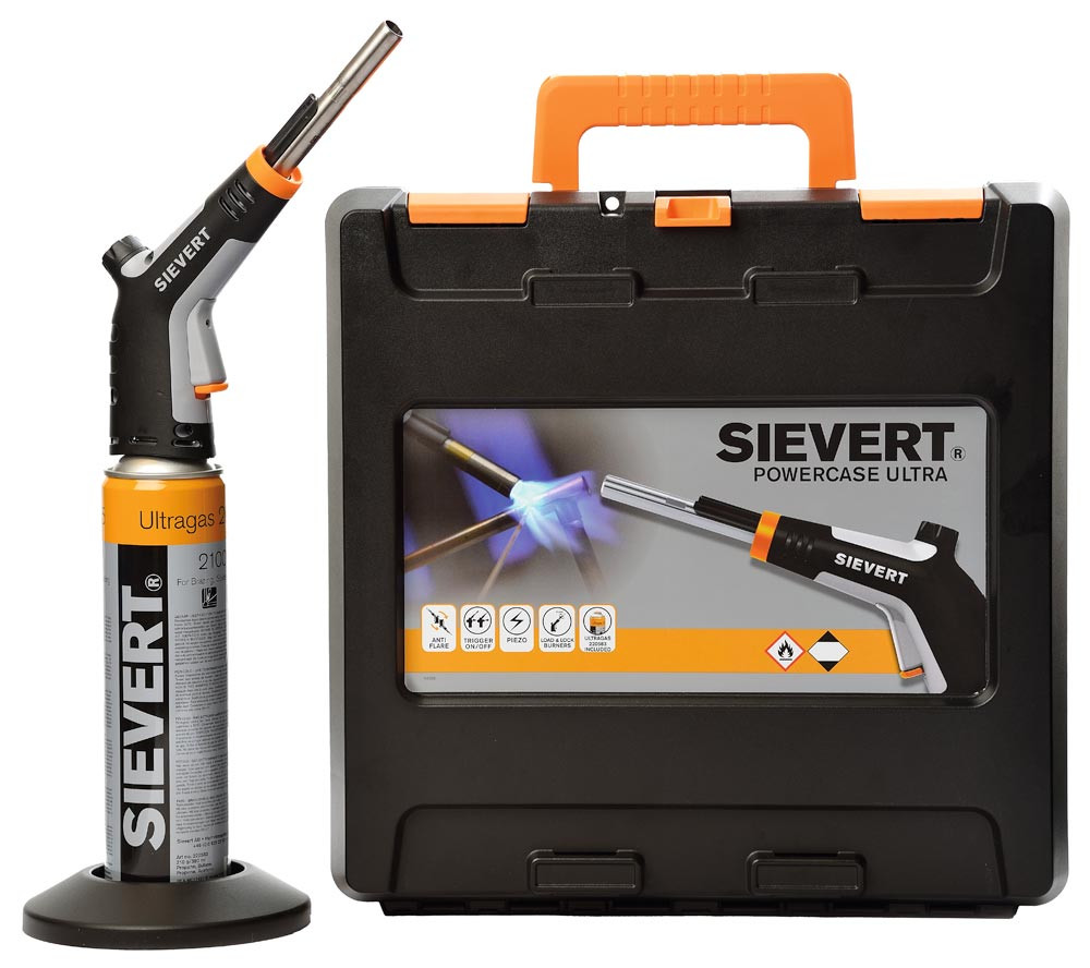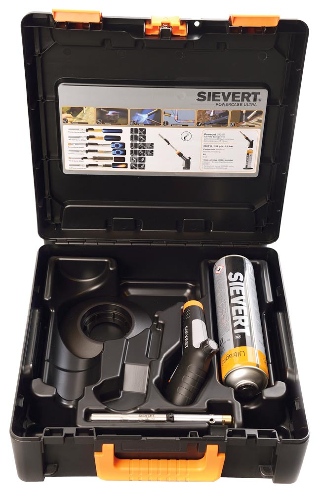 Inhalt: 1 PowerJet Lötlampe (EU Anschluss) ∙ 1 Zykonbrenner 8706, 14 mm ∙ 1 Stützfuss für Gaskartusche ∙ 1 Powercase Transportkoffer ∙ 1 Ultragas 2205 Kartusche ∙ Platz für eine zusätzliche Gaskartusche ist vorhanden
