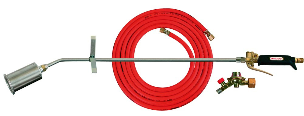 Ausführung: Komplette Brennergarnitur mit Propanregler für 5, 11 oder 33 kg Propangasflaschen ∙ Garnitur bestehend aus Handgriff mit Gasregel- und Sparflammenventil, Brennerrohr 600 mm mit Abstützbügel, Hochleistungsbrenner 60 mm Ø und 5 m Propan-Hochdruckschlauch (DN 6,3) G 3/8" LH und Regler mit Schlauchbruchsicherung