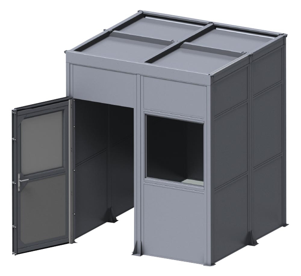 Ausführung: Geschlossene Schleifkabine mit Klapptür, Fenster und Dach ∙ Schallschutzelemente aus kaschierter Mineralwolle, 1 x 50 mm dick, außen Vollblech, innen Lochblech ∙ Robuste Schraubkonstruktion aus Stahlblech mit Pulverbeschichtung ∙ Fenster, Scheibe klar, 860 x 860 mm ∙ Klapptür, 2.025 x 920 mm ∙ Farbe grau, RAL 7040