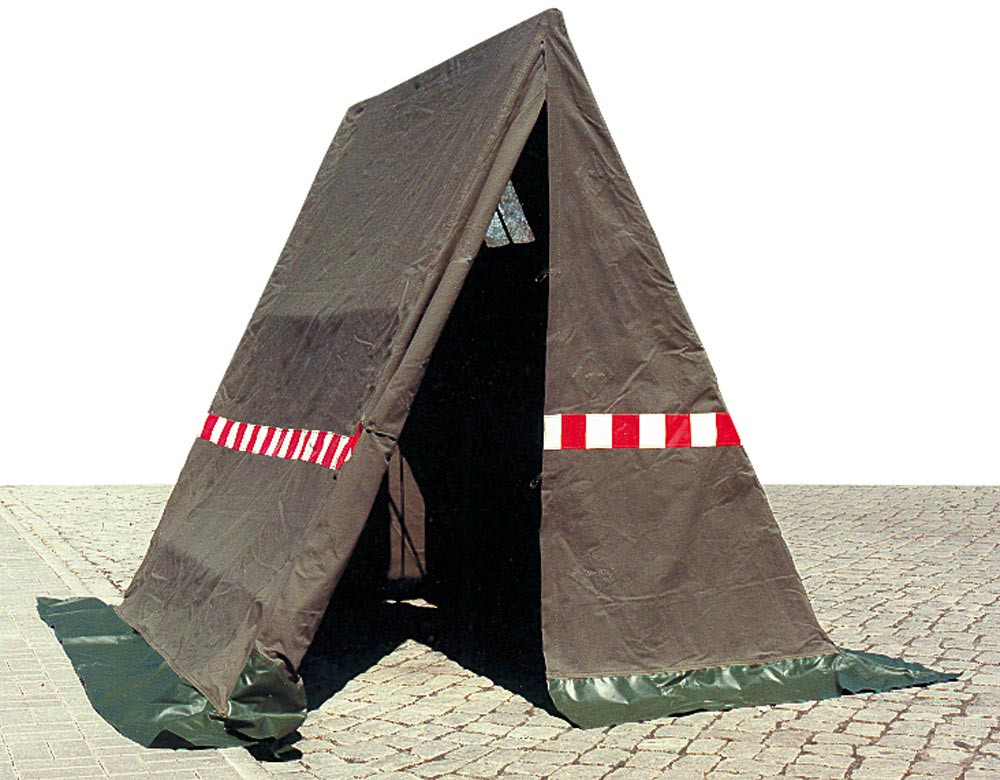 Ausführung: Arbeitszelt aus imprägniertem Baumwollgewebe ∙ Komplett mit Gestänge ∙ Farbe oliv, mit rot-weißen Reflexstreifen