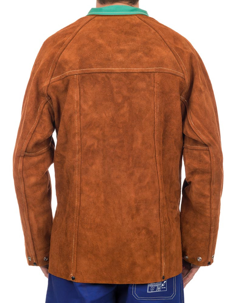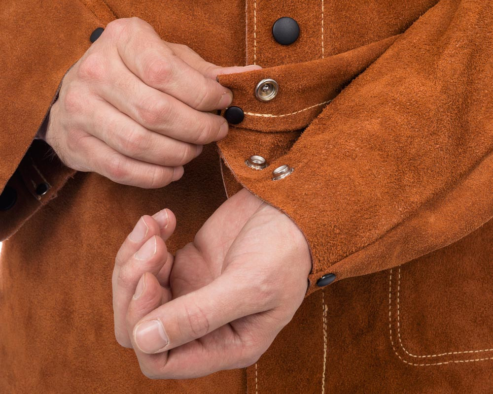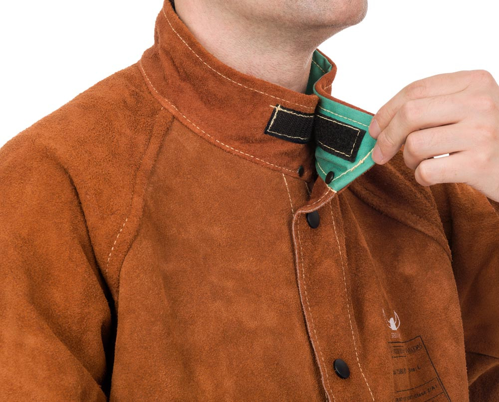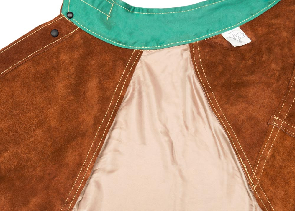 Zertifiziert nach EN ISO 11611:2015, Klasse 2 A1+A2, TÜV BP 60126846 0001 und TÜV 21285003 001 ∙ Aus langlebigem und geschmeidigem Spalt-Rindleder (aus der Seite hergestellt) ∙ Hitze- und feuerbeständig ∙ Ledernähte mit Doppelkettenstich aus extrem hitzebeständigem, 5-fachem KEVLAR®-Garn vernäht ∙ Alle Spannungspunkte genietet oder mit doppeltem Leder verstärkt ∙ Alle Druckknöpfe zur Sicherheit stromisoliert ∙ Kragen gefüttert mit hautfreundlichem und schweißaufnehmendem Baumwollsatin ∙ Schulter und obere Ärmel gefüttert ∙ Farbe Lava Brown™