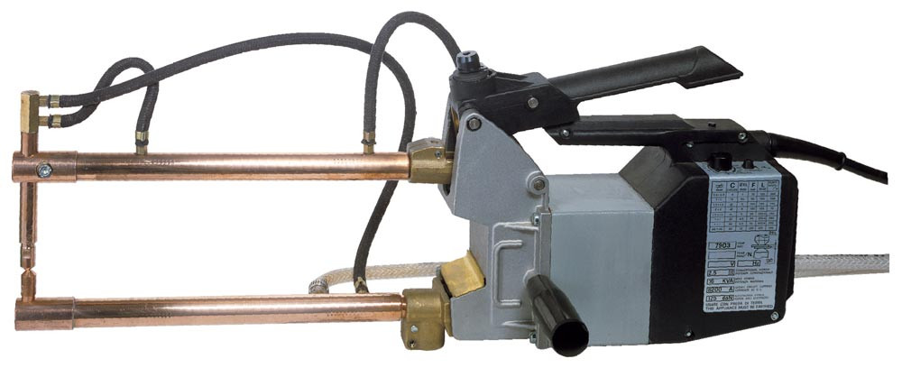 Ausführung: Leichte, vielseitig anwendbare Punktschweißzangen mit integriertem, elektronischen Synchronzeitgeber mit SCR 2-65 Perioden ∙ Steuerung des Zeitreglers durch einen Kompensationskreis (nur bei Stromfluß am Schweißpunkt) ∙ Ausgezeichnete Ergebnisse beim Schweißen auf Blech mit Lackspuren, oxydierten Teilen oder auf verzinktem Blech ∙ Zusätzlicher unterer Armanschluß zur Vergrößerung des Armabstandes ∙ Mit Transformator der Isolationsklasse F, getestet mit 4000 V-Wechselstrom
