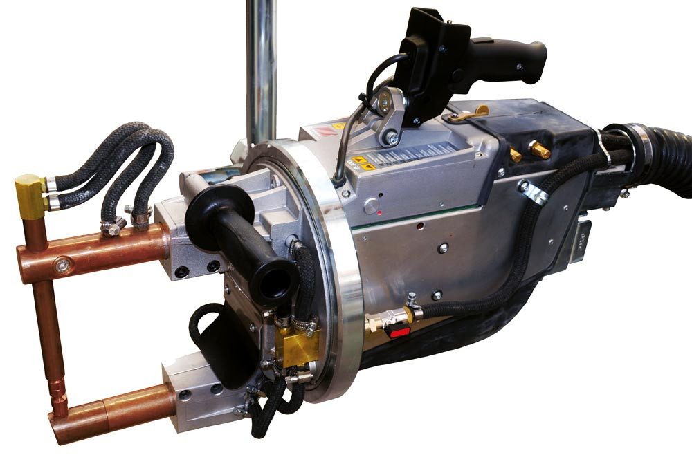 Ausführung: Pneumatische, wassergekühlte Produktionspunktschweißzangen in kompakter Bauform mit vollständig in den Handgriff integrierter Elektronik-Steuerung für erhöhte Produktivität, verbesserte Mobilität sowie erhöhte Schweiß- und elektrische Leistung ∙ Geschlossenes Gehäuse für leichtes und sicheres Arbeiten ∙ Kugellagerrundführung erlaubt zusammen mit einem Balancer das Arbeiten in allen Freiheitsgraden ∙ Mit Sperrvorrichtung zur Verhinderung des Verdrehens der Zange ∙ Einstellungen, wie z. B. der Abstand, ein kleiner Kurzhub für rasche Punktfolgen sowie ein großer Langhub zum Schweißen an schwer zugänglichen Stellen, sind an den Armen und Elektroden einstellbar ∙ Die komplette Kühlung, die FI-Schutzschaltung, der Überlastschutz sowie verchromte Zylinderwände und Kolben sorgen für maximale Sicherheit, hohe Belastbarkeit und eine lange Lebensdauer der Zangen