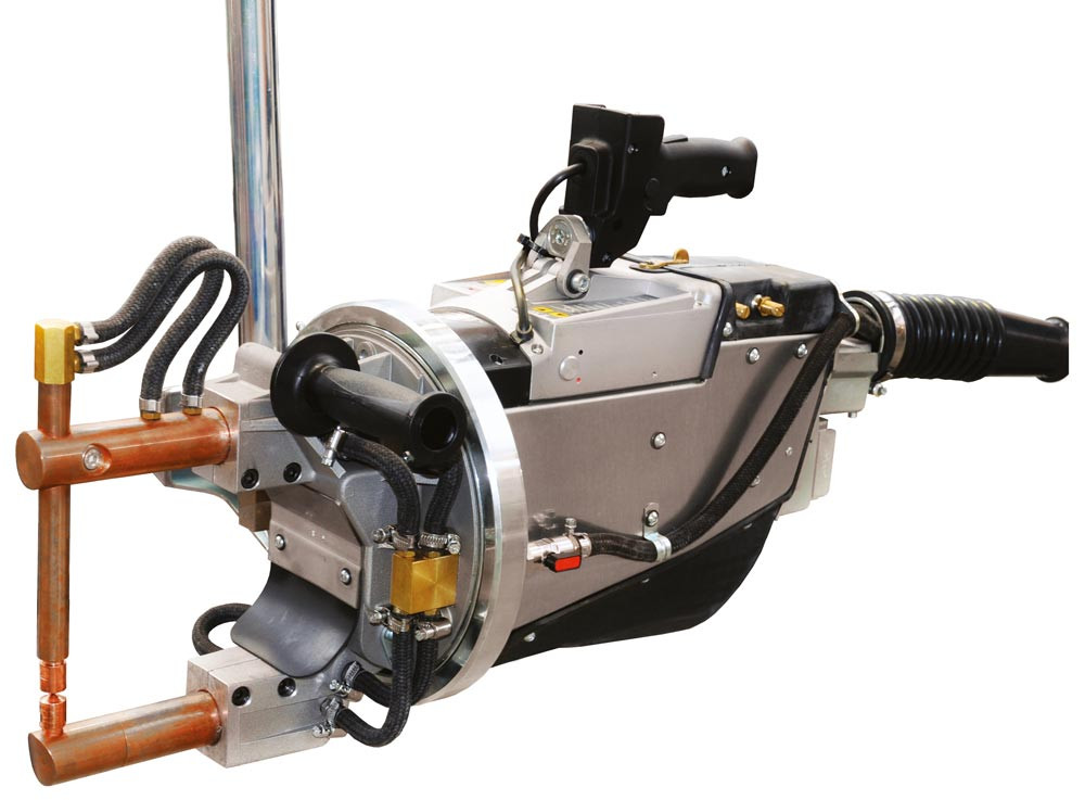 Ausführung: Pneumatische, wassergekühlte Produktionspunktschweißzangen in kompakter Bauform mit vollständig in den Handgriff integrierter Elektronik-Steuerung für erhöhte Produktivität, verbesserte Mobilität sowie erhöhte Schweiß- und elektrische Leistung ∙ Geschlossenes Gehäuse für leichtes und sicheres Arbeiten ∙ Kugellagerrundführung erlaubt zusammen mit einem Balancer das Arbeiten in allen Freiheitsgraden ∙ Mit Sperrvorrichtung zur Verhinderung des Verdrehens der Zange ∙ Einstellungen, wie z. B. der Abstand, ein kleiner Kurzhub für rasche Punktfolgen sowie ein großer Langhub zum Schweißen an schwer zugänglichen Stellen, sind an den Armen und Elektroden einstellbar ∙ Die komplette Kühlung, die FI-Schutzschaltung, der Überlastschutz sowie verchromte Zylinderwände und Kolben sorgen für maximale Sicherheit, hohe Belastbarkeit und eine lange Lebensdauer der Zangen