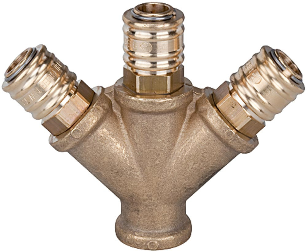 Ausführung: Eingangsseite mit Innen (IG)- oder Außengewinde (AG) ∙ Ausgangsseite wahlweise mit 2 oder 3 montierten Messing-Luftkupplungen